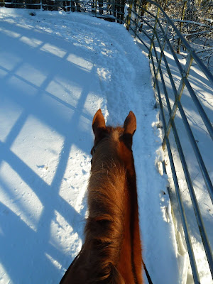 I did get Lance out for a ride in our snow-covered arena on Sunday. Yesterday I decided we'd have better footing on our thawing gravel lane, so we schooled there and cooled out in a snowy field.