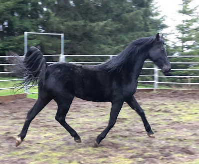 I see a blacker, sleeker, fitter, more filled-out mare whose neck has gone from upside-down to rightside-round. I see a horse who trusts me, comes to me, and tries for me. I guess she really has 'come a long way, baby'!